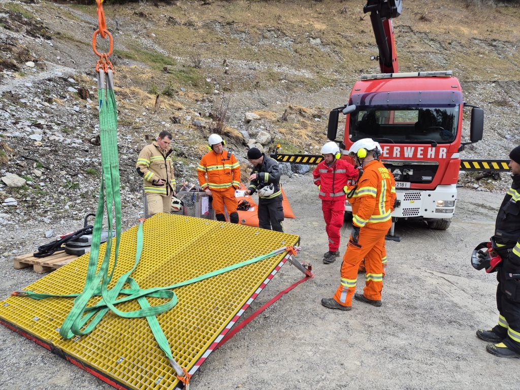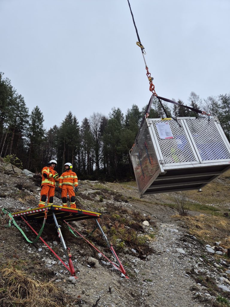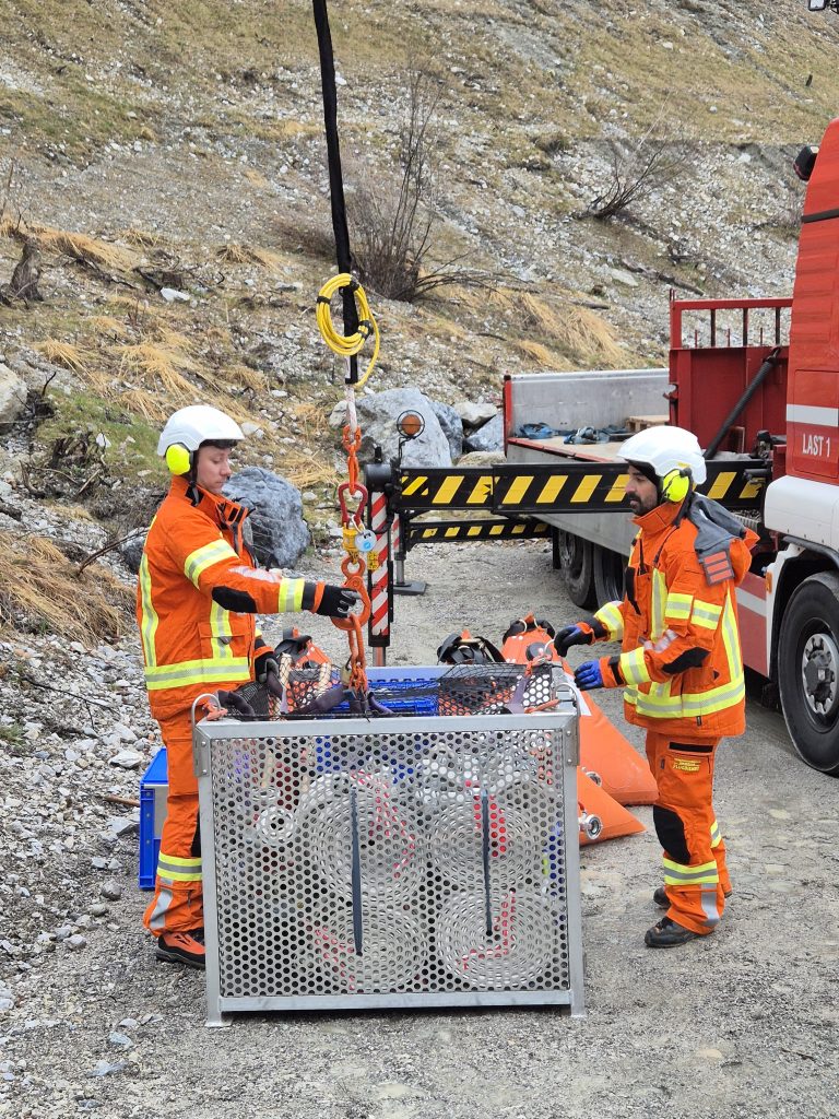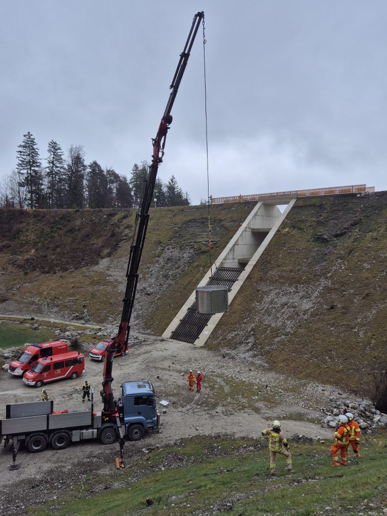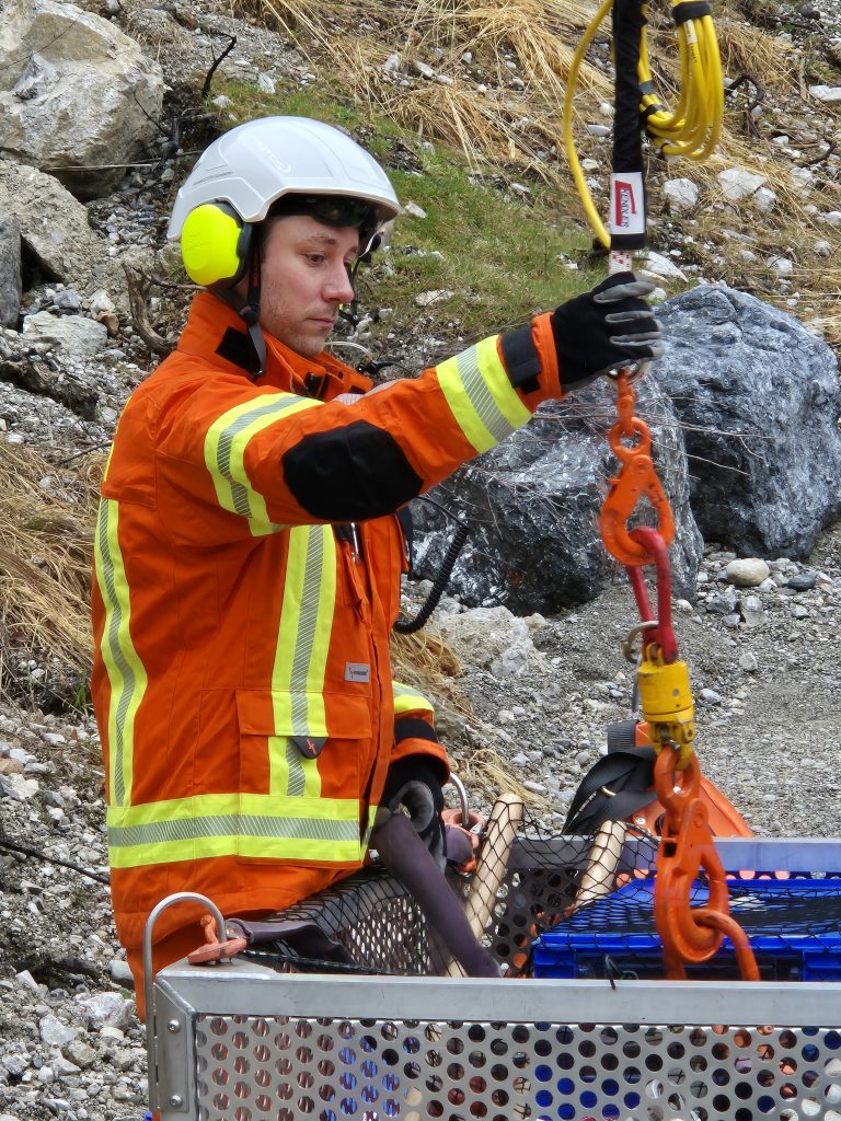 Station 3: Materialtransport im Gelände – Aufstellen und Handhabung der Steinbock Plattform, Einfliegen von Materialkisten sowie Verwendung des 300 Liter Stilwellbehälters