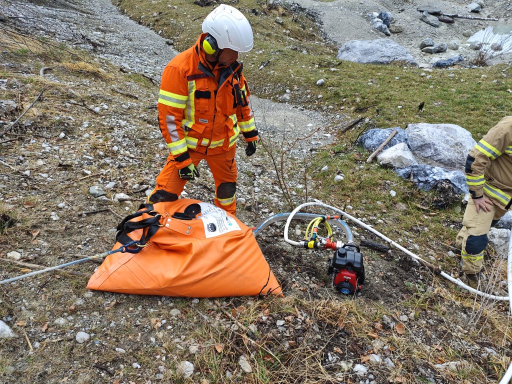 Station 2: Löschwasserversorgung im Gelände – Aufstellen des 3000 Liter Alubehälters im Gelände, Vorbereitung BambiBucket und Befüllen des Behälters mittels BambiBucket