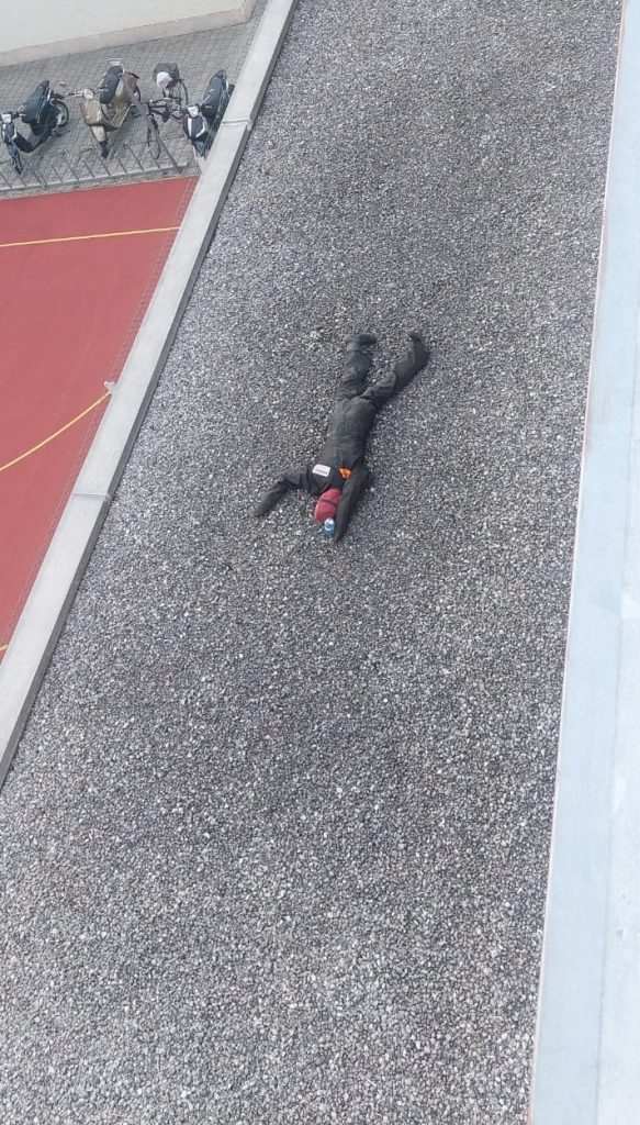 Mittels DL30 wurden mehrere Personen von einer Dachterrasse gerettet, eine Person wollte sich selbst retten und stürzte dabei auf ein Vordach. Die verletzte Person wurde durch die Mannschaft des KLFA mittels Schleifkorbtrage über eine Schiebeleiter gerettet und dem Rettungsdienst zugeführt.