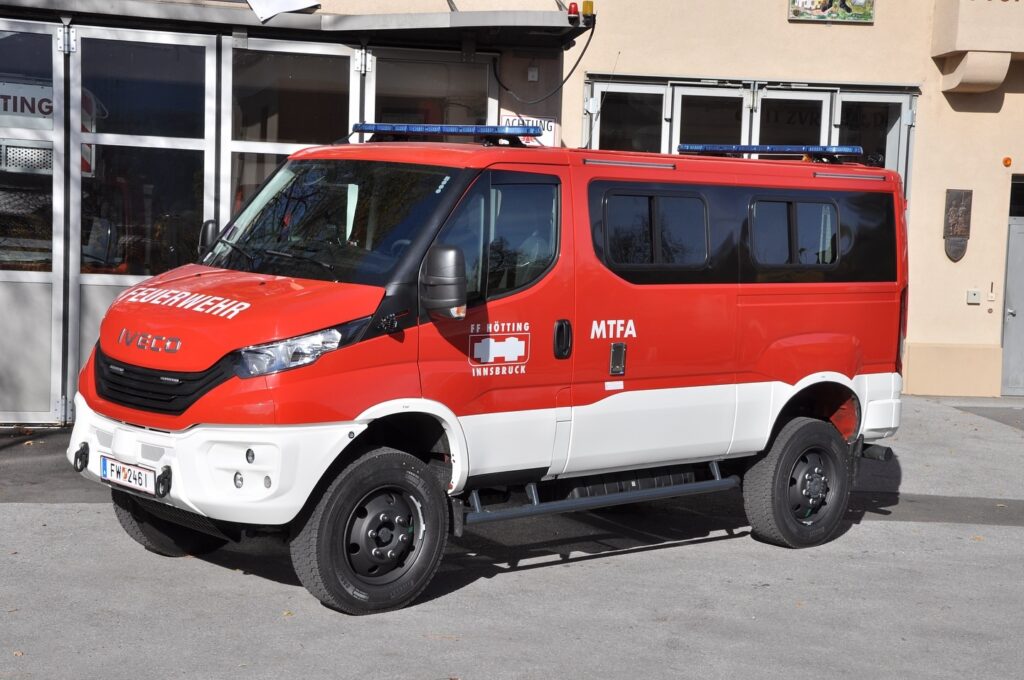 Das Kommando-Fahrzeug, ein Volkswagen Caravelle Motion, Baujahr 2017, Fahrgestell, 5-Sitzer, Allradantrieb, wurde durch Eigenmittel der FF Hötting sowie mit Unterstützung des Landes- und Bezirksfeuerwehrverbandes finanziert. Die primäre Aufgabe des Fahrzeugs besteht im Transport des Einsatzleiters bzw. des Kommandos als Einsatzleitung. Mit nur wenigen Handgriffen kann es jedoch auch zu einem Mannschaftstransportfahrzeug (MTF) umgerüstet werden und wird somit vielseitig eingesetzt – unter anderem für den Transport unserer Flughelfer sowie der Feuerwehrjugend. Zur Ausrüstung gehören unter anderem Feuerlöscher, Absperrmaterial, Funkgeräte, Flughelferhelme sowie die Brandschutzmappen und Objektpläne der Brandmeldeanlagen in unserem Zuständigkeitsbereich. Ein modernes, wendiges und geländetaugliches Einsatzfahrzeug, das uns insbesondere bei der Ersterkundung am Einsatzort wertvolle Vorteile verschafft.